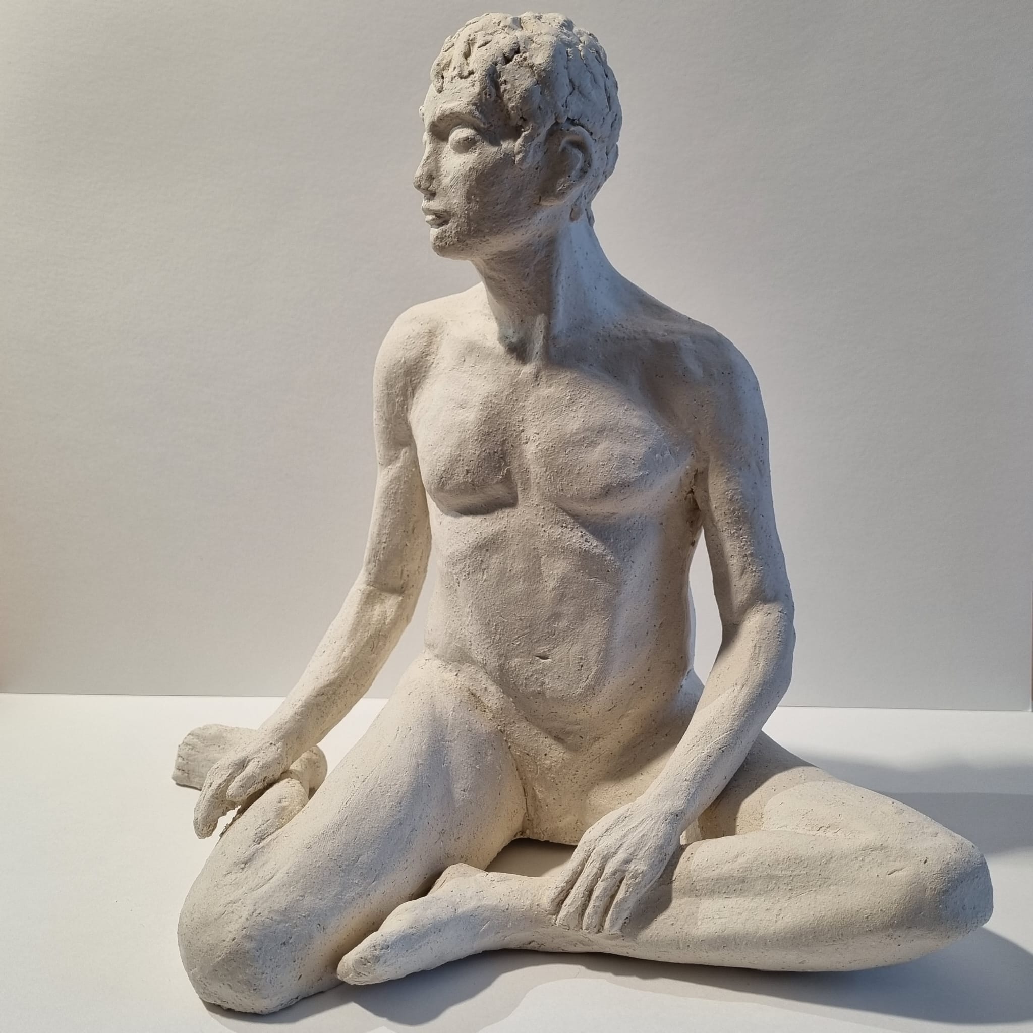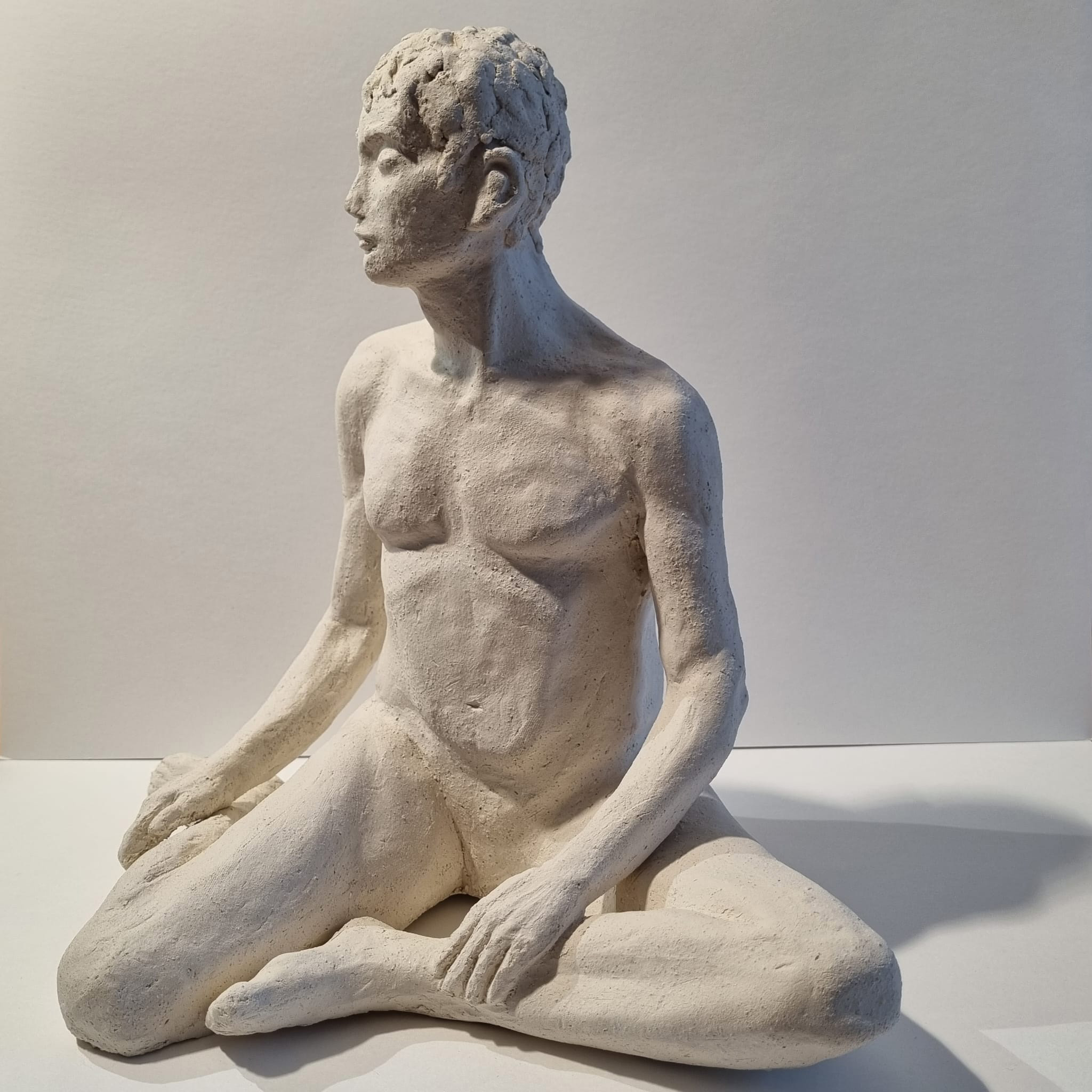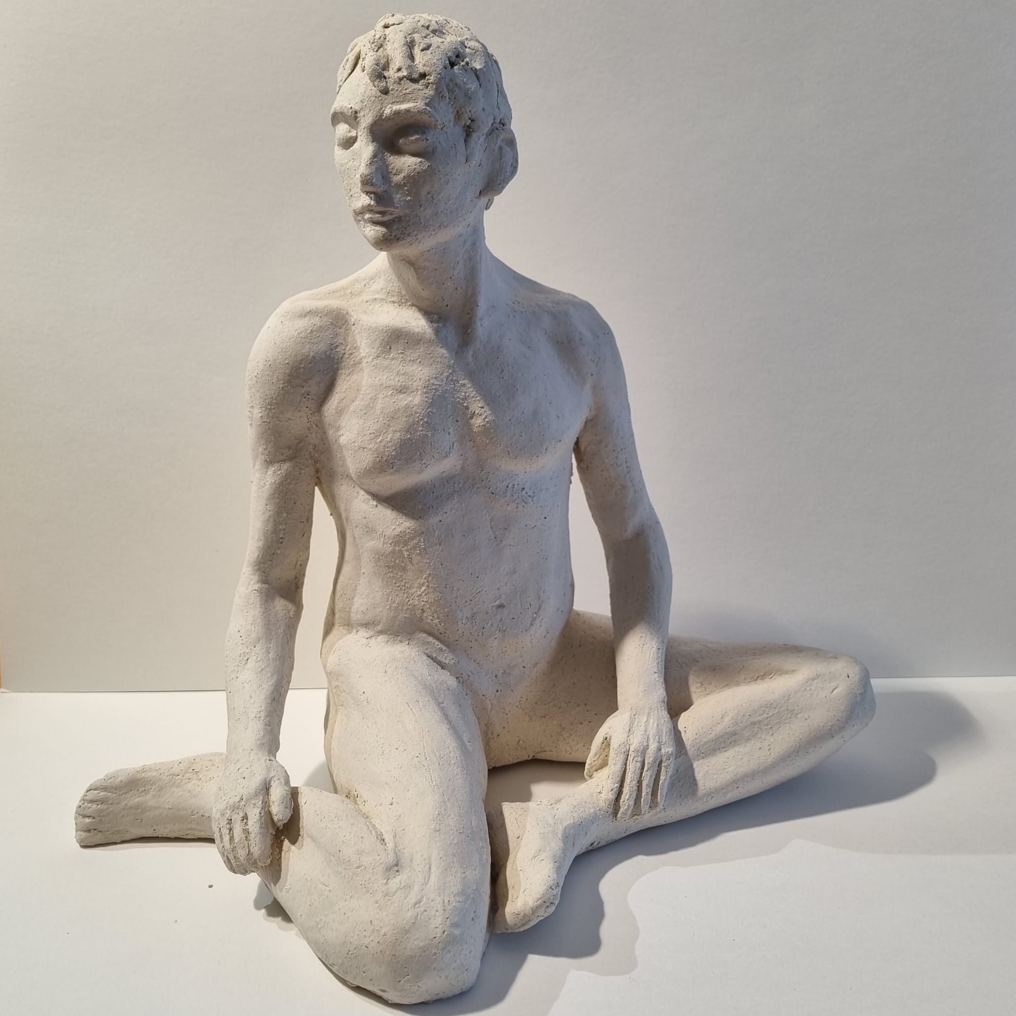 Réalisation d’un homme assis en torsion à l’occasion d’un stage de modelage avec un modèle nu (3 séances). Cet homme au trait fin et jeune est, sans aucune arrière pensée, un eunuque.