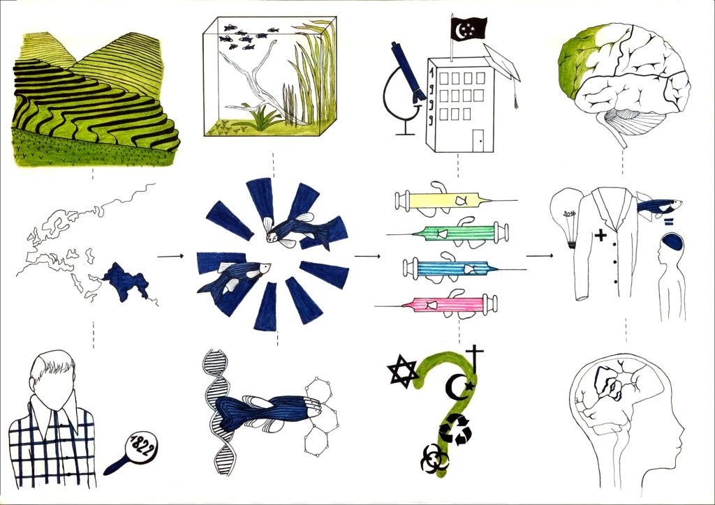 Mes choix se sont portés sur des magasins, qui sont une référence à la fast-fashion (Uniqlo, Zara et H&M). La rue de Rennes célèbre comme lieu de shopping à Paris est centrale sur ce dessin. Des centres commerciaux et des magasins de grande puissance mondiale encadrent cet espace. Pour chacun, j’ai choisi un bâtiment dont l’architecture est idyllique et incitative.